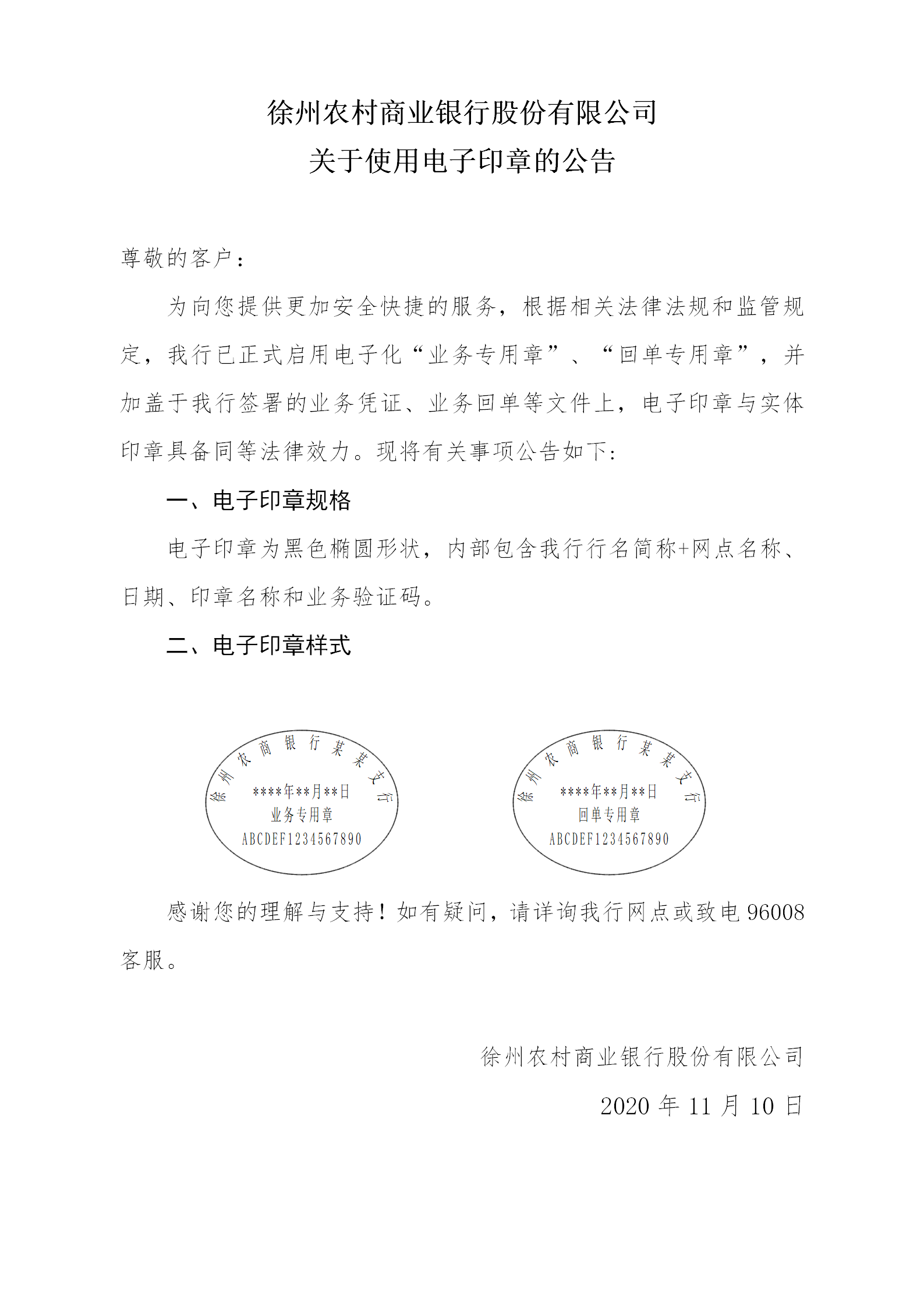 徐州农村商业银行股份有限公司关于使用电子印章的公告