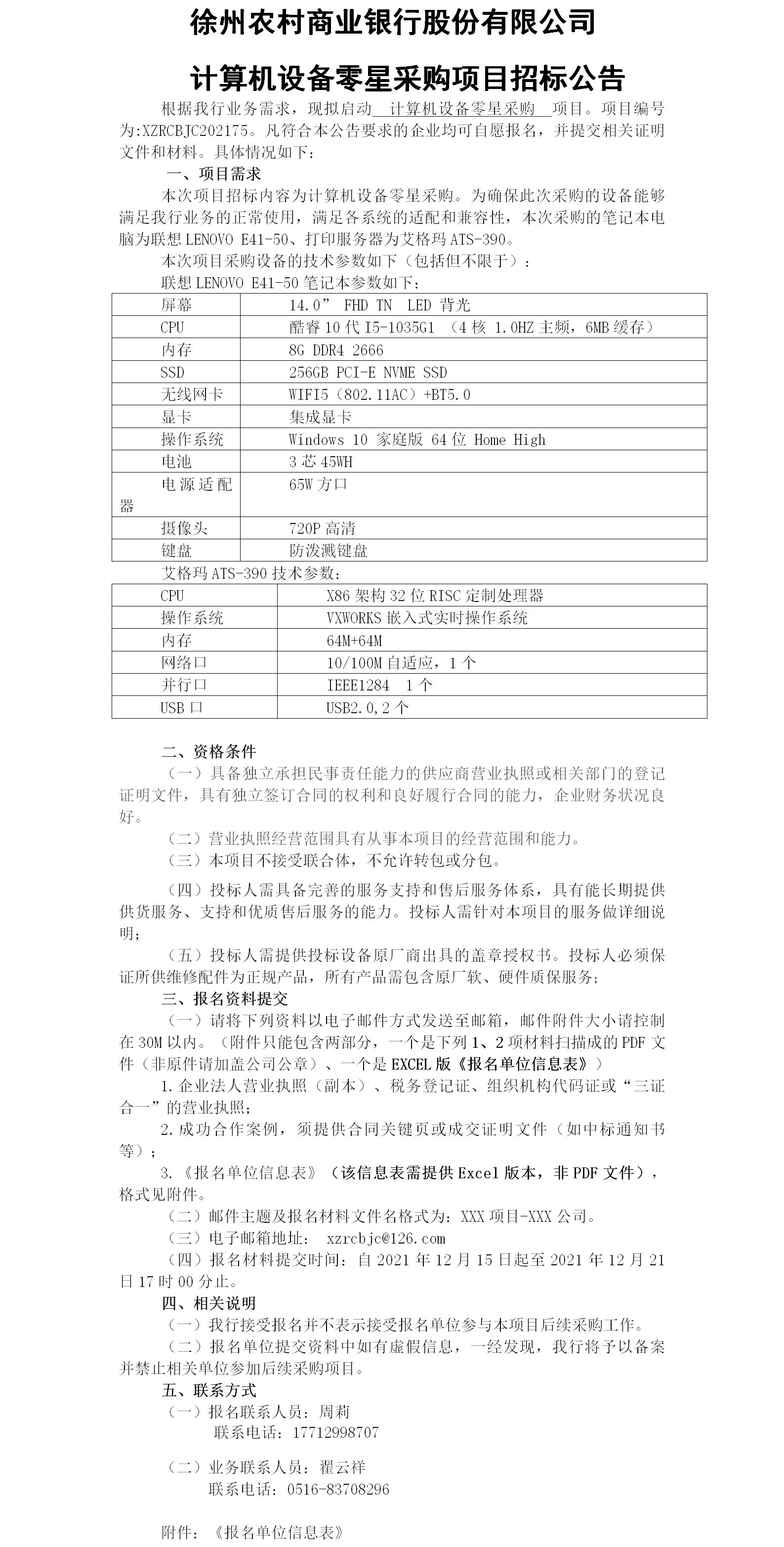 徐州农商银行计算机设备零星采购项目招标公告