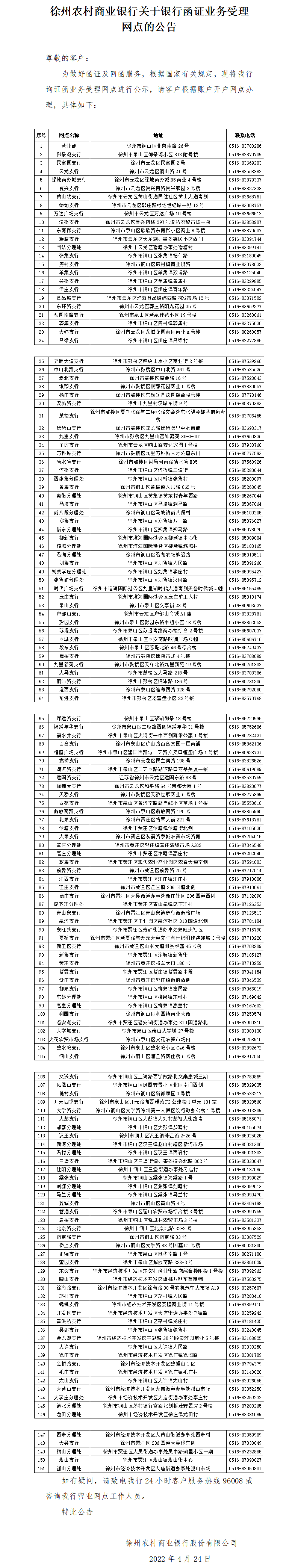 徐州农村商业银行关于银行函证业务受理网点的公告