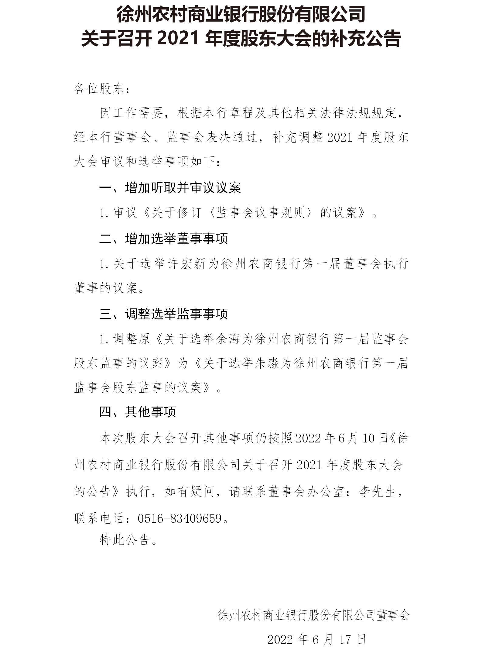 徐州农村商业银行股份有限公司关于召开2021年度股东大会的补充公告